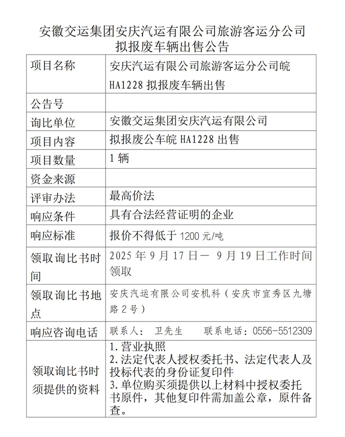 旅游客運(yùn)分公司擬報(bào)廢車輛出售公告