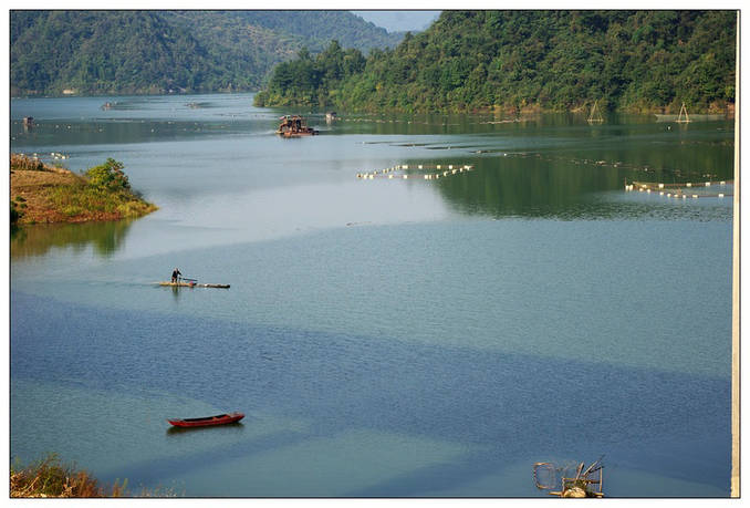 不知過了多久!也不知穿過了多少座隧道!我依然沉浸在遠離凡塵喧囂的鬧市、相伴于群山峻嶺,四季如春綠油油松柏夾雜著少許紅楓秋葉的幻想之中,間或在轉(zhuǎn)瞬即逝日薄西山的余暉照映下熠熠生輝!此時此刻的我已經(jīng)是到了忘我的最高境界,腦中忽然閃過歐陽老翁的一句至理名言——【醉翁之意不在酒,而在乎山水之間!】這句話用在此處真的是妙不可言!我那萬千思緒隨著飛馳的車輪早已飄到九霄云外,暗自為窗外如畫如詩的景象所迷惑、所陶醉、所依戀...!猛然間聽到一句非常熟悉且溫暖的話——爸爸!快看!到了磨子潭風(fēng)景觀賞區(qū)了!我才恍然如夢驚醒,朝遠處向下望去好一個一望無際的“磨子潭”!其潭水清澈,魚影可現(xiàn);微風(fēng)襲來,碧波蕩漾;譚中游筏,漁歌互答;這時女兒也詩意助興了!滿懷深情地吟誦——“磨子潭水-深千尺,不及‘爸媽’-送我情!”這句真是太絕了!女兒漸漸地長大了,懂得感恩戴德了。車子終于快要鉆進最后一個隧道了,我也不知道它是排第幾?感覺今天好像是專乘“高速隧道”之旅了?!在快要進入末了隧道的一霎那,我還特留戀地回頭朝窗外俯視一下,只見磨子潭中那無數(shù)的‘網(wǎng)箱’把整個潭水劃分成大小不等的方塊,好像一張碩大無比殘缺不全的圍棋盤面撒在幽深的譚中,我還來不及細數(shù)就立刻消失在我難以忘卻的視線中.....!