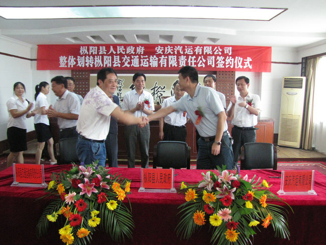 2011年9月1日,樅陽縣人民政府、安徽省交通集團安慶汽運有限公司整體劃轉(zhuǎn)樅陽縣交通運輸有限責任公司簽約儀式在樅陽迎賓館會議大廳內(nèi)隆重舉行。樅陽縣縣長何謙、副縣長胡海峰,省交通集團汽車運輸有限公司副總經(jīng)理方詩喬,安慶汽運有限公司董事長張進、黨委書記徐軍、副總經(jīng)理王中明、彭宏、紀委書記郭峰,樅陽縣交通運輸有限責任公司經(jīng)理童子健出席了簽約儀式。